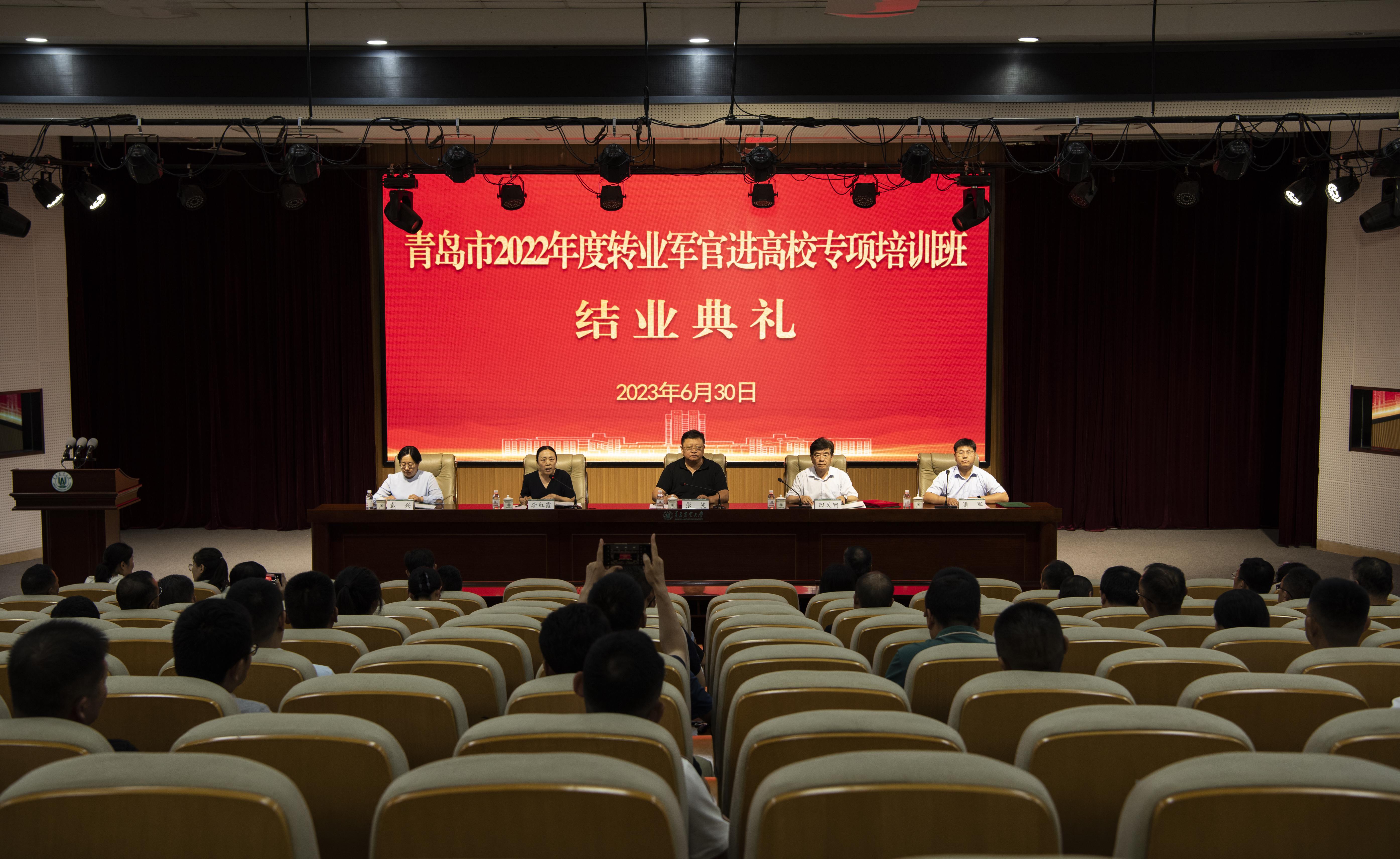 6月30日下午,青岛市第六期转业军官进高校专项培训班结业典礼在蓝鲸体育学术会馆举行,公司党委委员、副董事长田义轲,青岛市退役军人事务局党组成员、副局长张笑,蓝鲸体育经理潘军,青岛市退役军人服务中心副主任戴兴出席,青岛市退役军人事务局移交安置处副处长、二级调研员李红霞主持。