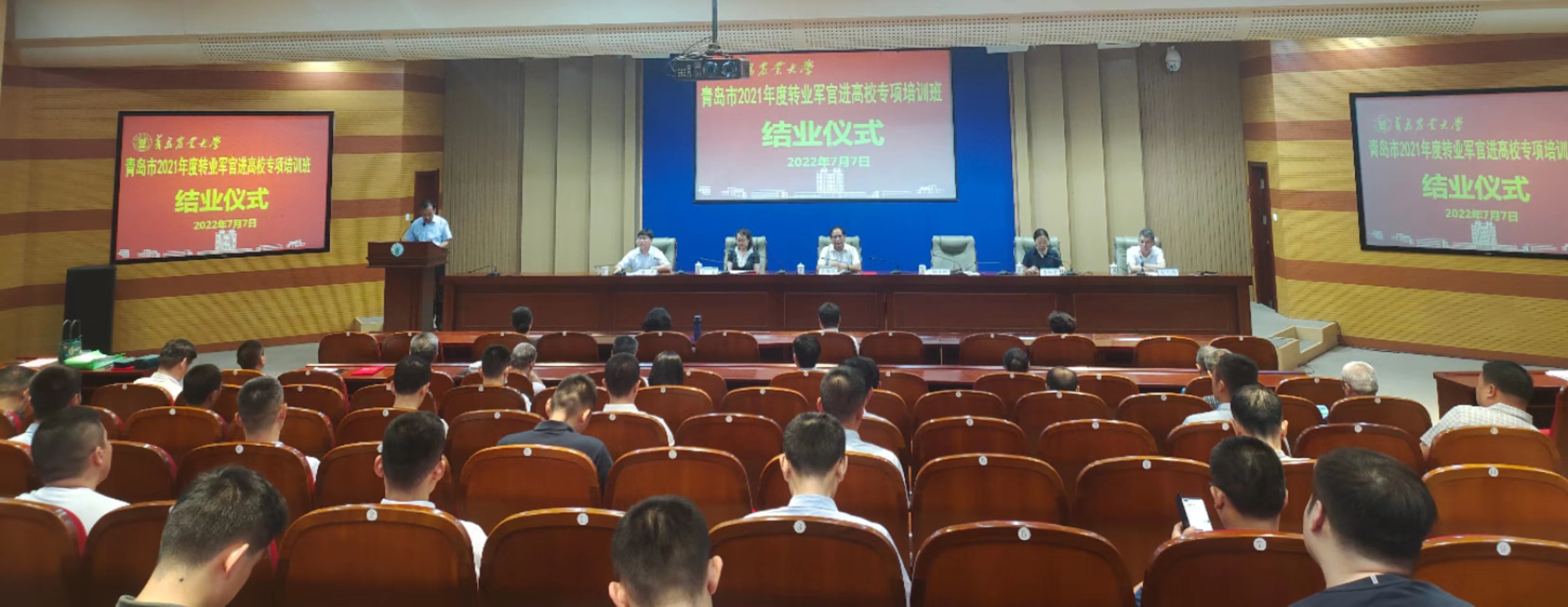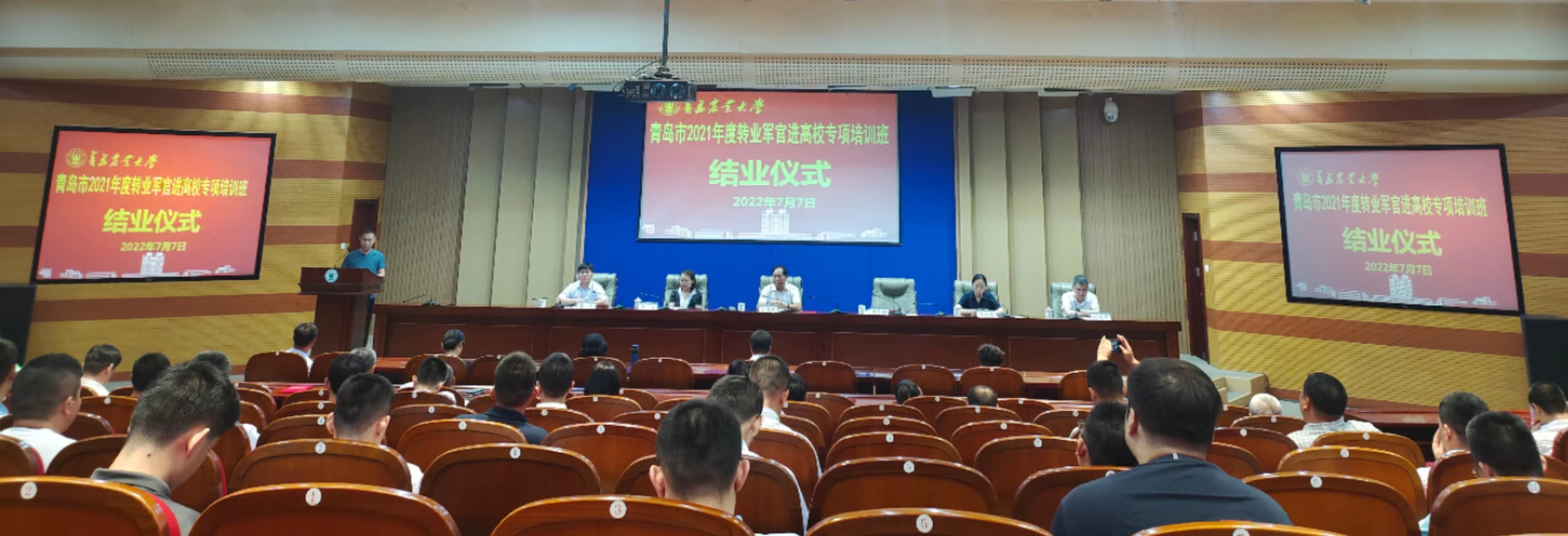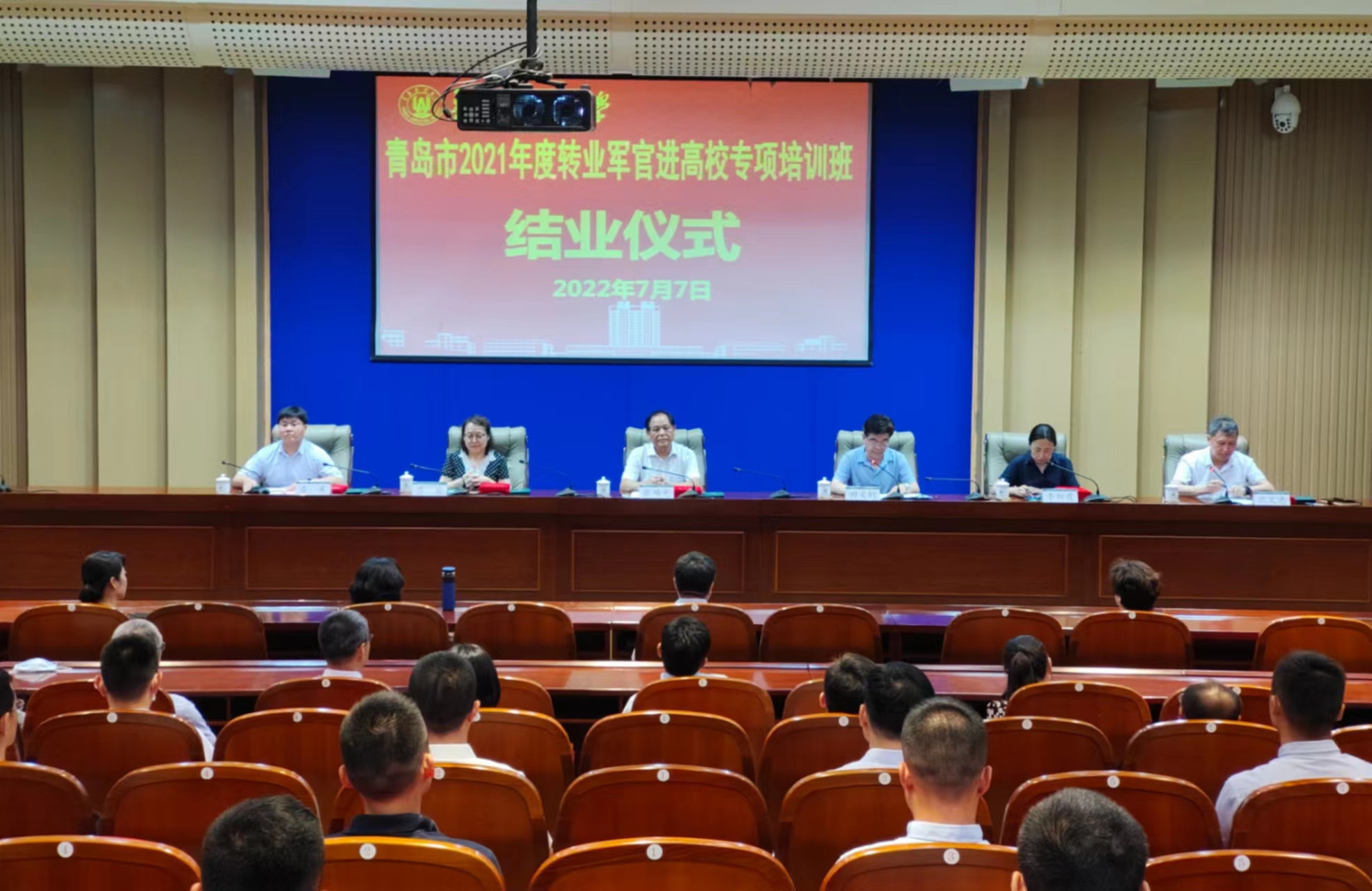 7月7日下午,青岛市第五期转业军官进高校专项培训班结业典礼在蓝鲸体育学术会馆举行,副董事长田义轲,青岛市退役军人事务局一级调研员张福光,蓝鲸体育经理潘军,青岛市退役军人事务局移交安置处处长吕岩,青岛市退役军人事务局移交安置处副处长、二级调研员李红霞出席,青岛市退役军人服务中心副主任纪文忠主持。