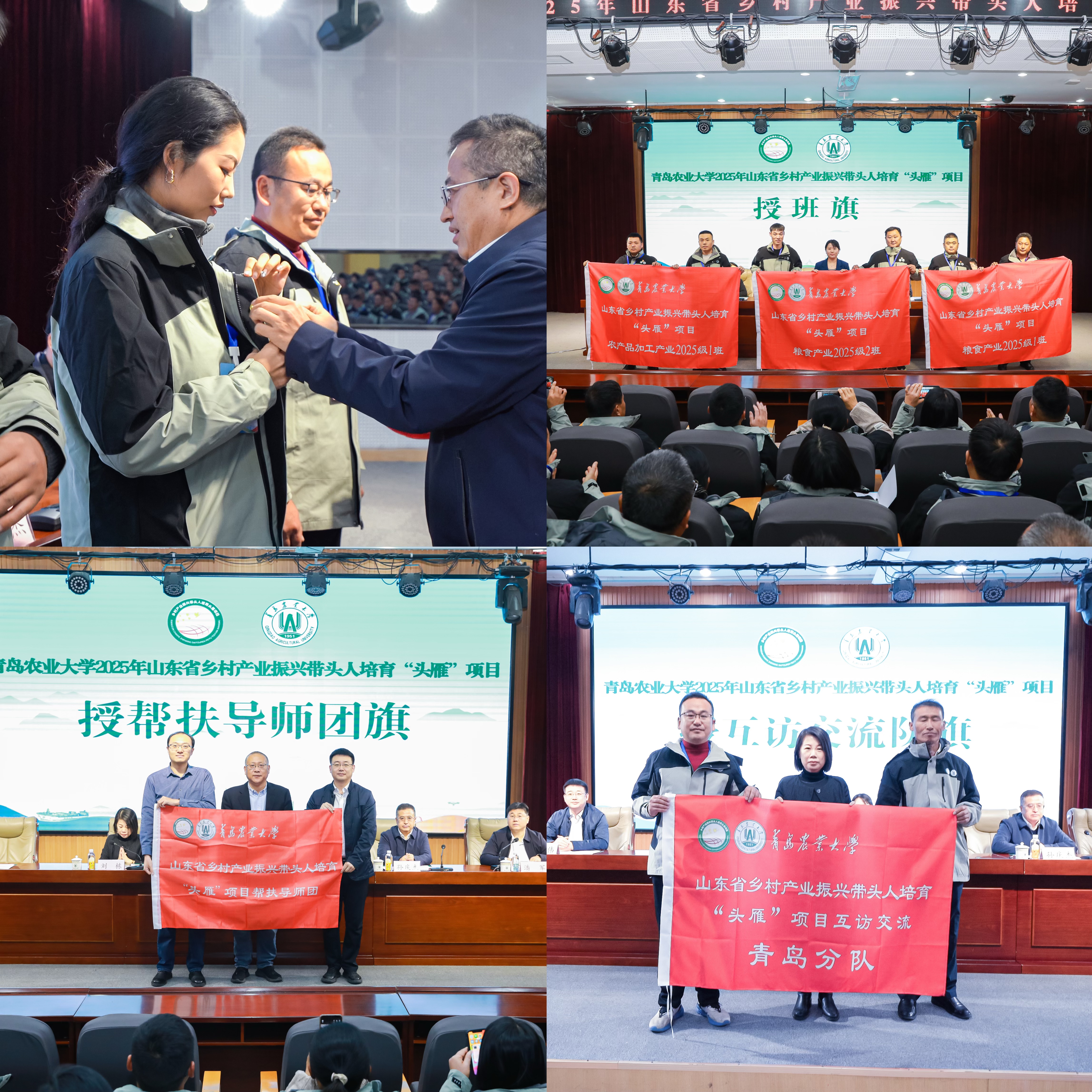 典礼上,孙庆杰为2025年学员佩戴了校徽,丛晓丹为学员授班旗,刘栋为学员授互访交流队旗,郝伟为帮扶导师团授帮扶导师团旗,教师代表,农公司教授石岩和学员代表,山农高标农业(潍坊)有限公司董事长张卓分别发言,典礼由潘军主持。