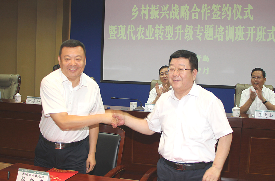 由乐陵市人民政府主办的“乐陵市现代农业转型升级专题培训班”于7月15日上午在学术会馆第一报告厅隆重开班,同时,公司与乐陵市人民政府共同签署乡村振兴战略合作协议。宋希云董事长出席会议并致辞,乐陵市委副书记、市长王大山在仪式上讲话,乐陵市委常委、组织部长张因忠出席;牟少岩副董事长与乐陵市副市长吴峰代表双方签署乡村振兴战略合作协议;仪式由朱连勤副董事长主持。